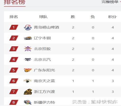 排在积分榜第2的是辽宁队,最近两场比赛,辽宁队的状态非常不错,先后击败了天津队和广厦队,这其中击败广厦队可以说是爆了不小的冷门。由于广东、北控等队也赢球的缘故,辽宁队的排名又上升一位,从积分榜第3名上升到第2。北控队这一战拿下天津队以后,他们的战绩也变成了2胜0负,一波两连胜后,他们的排名杀进积分榜第三的位置,而北京队则从积分榜第1,下滑到第4名。